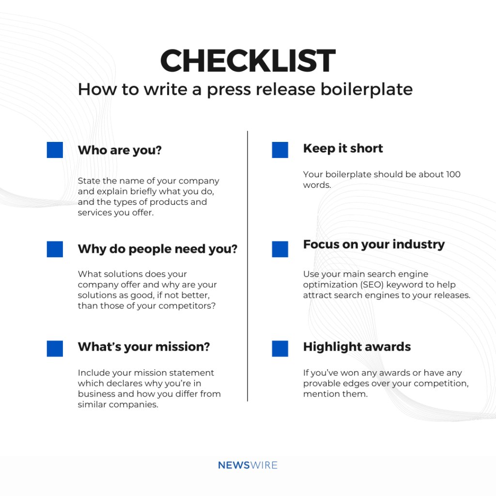 - Needs to be written only once and can be used in all subsequent press releases