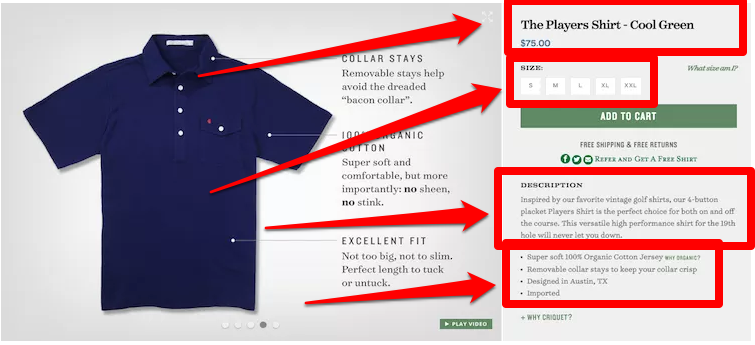 Product descriptions are often placed right next to the product or under the product title and images. A product description should be concise, genuine, and easily readable.