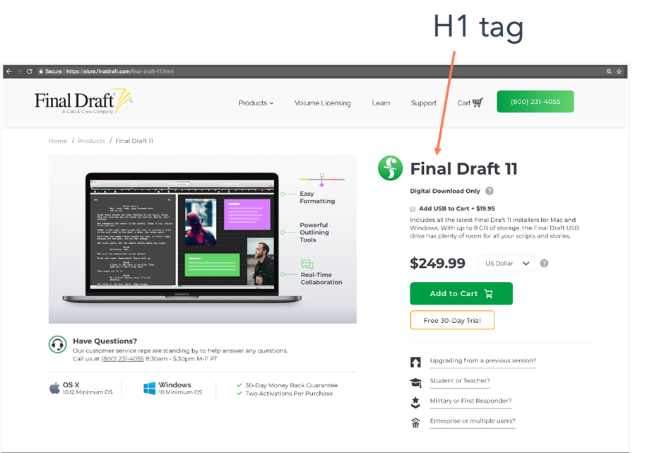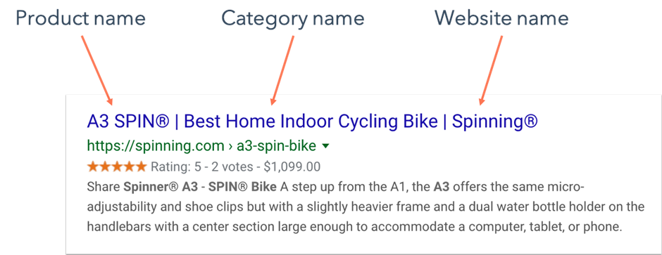 Though you get some flexibility with this, make sure to include a product name, website name, and category in your page’s title tag.