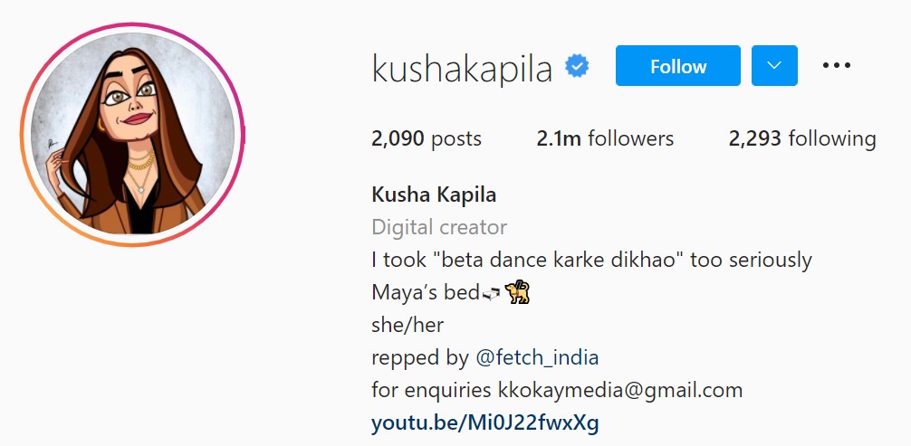 Kusha Kapila is the only Instagrammer invited to the Koffee With Karan talk show, which has a particular affinity toward high-flying Bollywood celebrities. She works for the online fashion portal iDIVA, where the audience adores her fictional character Billi Maasi.
