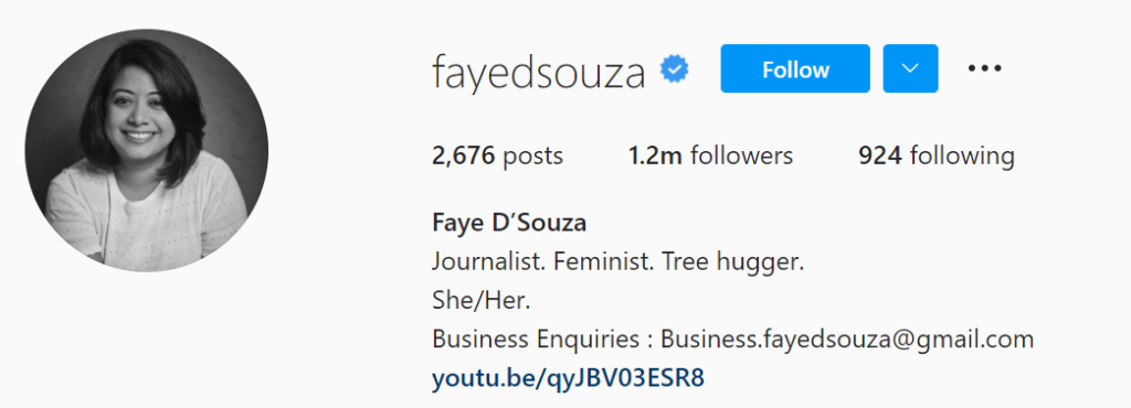 With more than 1.2M followers, Faye D’Souza is one of the leading Indian content creators on Instagram. She previously stormed the internet with her views against the male-dominated world. Having pursued journalism, D’Souza started her career at CNBC TV18, and joined The Times Of India. Her unbiased opinions have won the trust of her audience, and most of her followers are youngsters who feel that India needs more influencers like Faye D’Souza, who tells the news as it is – without bias.
