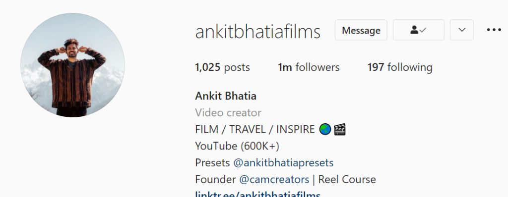 When it comes to travel, no one can beat Ankit Bhatia’s content. Having started off on TikTok, he now has 1M followers on Instagram and is engaged in uploading unique travel reels, photos, and videos on Instagram. His main goal for building a strong Instagram presence is selling his video presets and online travel video-making courses.
