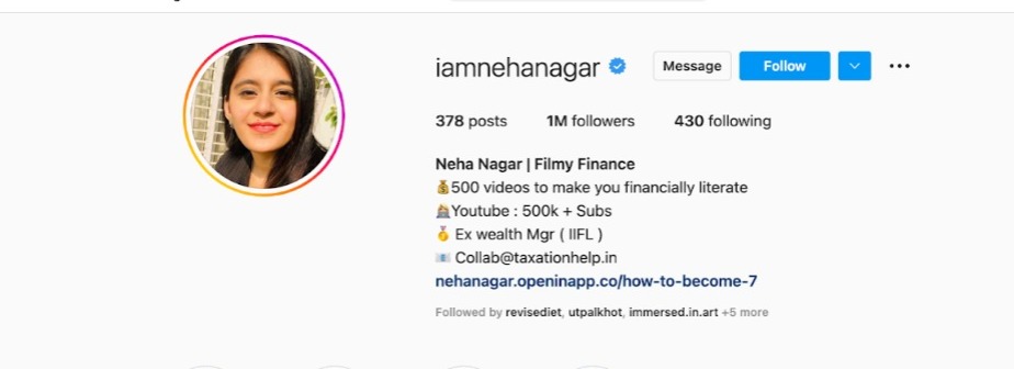 Neha Nagar is a successful Instagram influencer in the niche of financial literacy. Through her Instagram feed, she helps people by offering them financial literacy. With more than 800k+ followers on Instagram, she aims to be a financial guide and posts easy to understand videos for her followers.