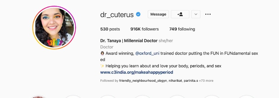 Popularly known as @dr_cuterus, Dr. Tanaya is a gynaecologist and a body literacy advocate. She talks about sexual and reproductive health on Instagram and focuses on myth busting facts in the form of her stories and reels. She is a loud advocate for sex education and open conversation about body and sex positivity.