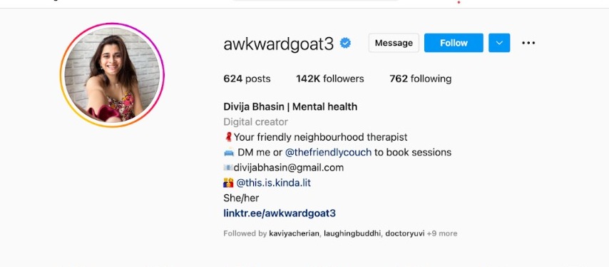 Divija’s @awkwardgoat3 content focuses on therapy, mental illness and the various myths in Indian society that focus on mental health. She also talks openly about how mental health professionals are a boon to the Indian audience and the importance of therapy.