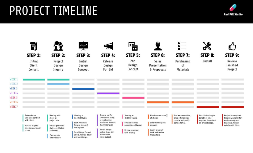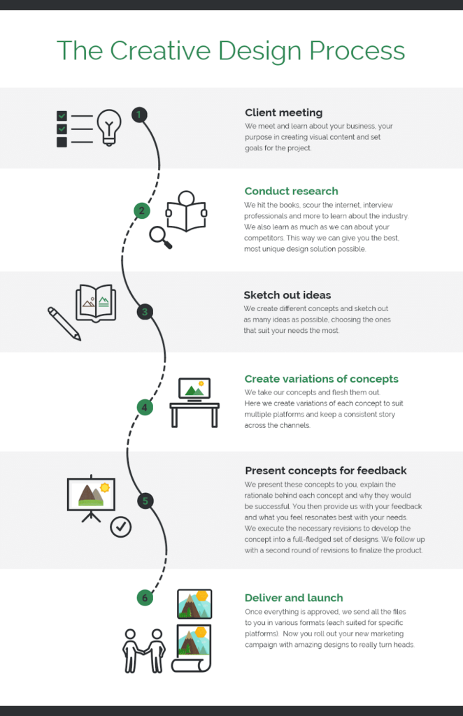 There’s a narrative in any set of data. Consider the tale you want to communicate before you start building your infographic. The information you include will be determined by the perspective you choose. For instance, the following infographic depicts the process of finishing a project from beginning to end. The information contained within it is concise, yet detailed. And the colors used help enhance its readability.