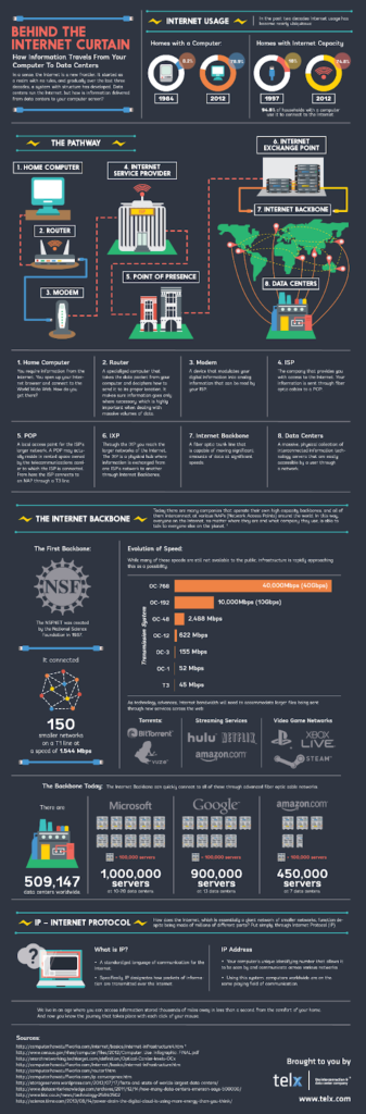 Apart from the color palette, it is the level of detail that has gone into making this infographic that makes it stand out. It features several sections, each of which explains different aspects of how information is transmitted from computers to data centers.