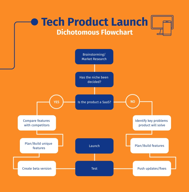 Use this template to design a visually appealing product launch infographic. You can develop tactics depending on what kind of technology you’re launching. If there are any other factors, you can further alter this flowchart.