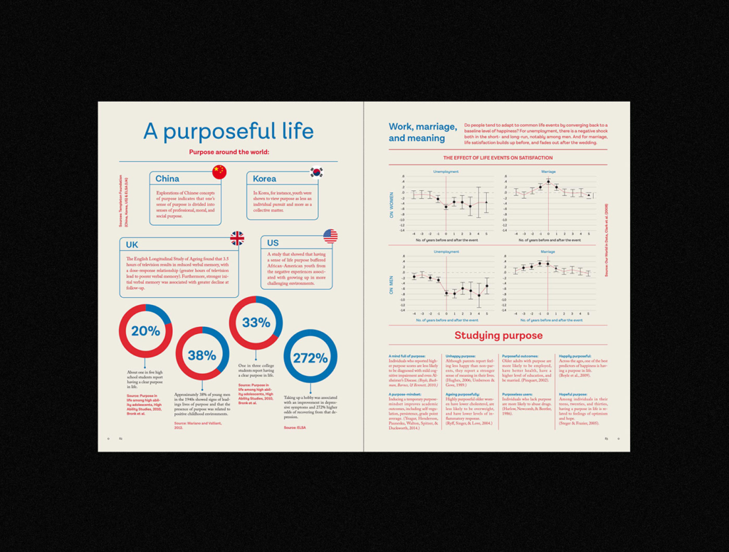 Studio Patten’s free infographic compiles various survey results on purposeful life and displays information in visually appealing infographics. Although the concept of living a purposeful life is complex, this infographic does an excellent job of simplifying the facts. In addition, the usage of text and data visualization elements is well-balanced.