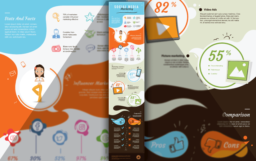 If you have a clever concept for fellow marketers or your followers, go ahead and use this infographic design template. The components include a review of numbers and information with icons, an overview of influencer marketing, a statistics section, and comparative visuals.