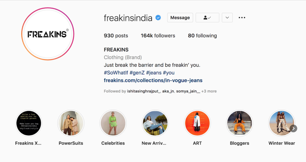 - Feature a bunch of Story Highlights that your audience can go through. This could be user reviews, product collection, FAQs, interesting events, etc. For example, Freakins has made great use of this feature.