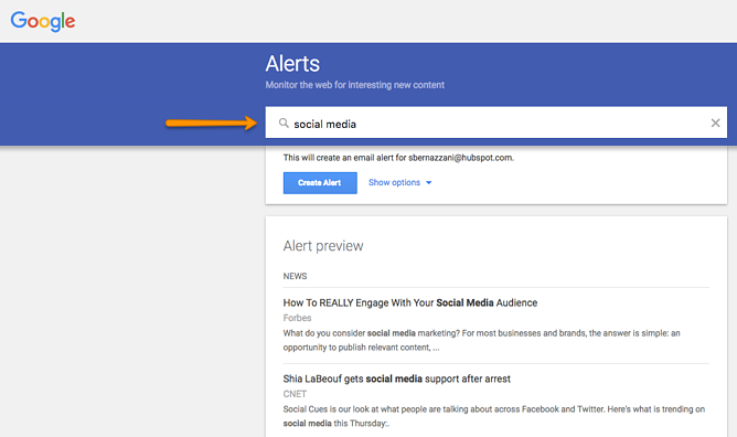 Setting up a Google Alert is super easy – requiring you just to sign in, enter a search term, choose a frequency, and how you want the content to be delivered.