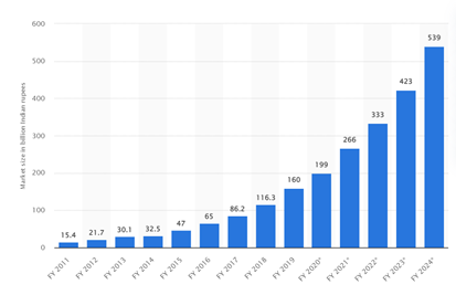 The market size of the digital advertising industry across India from the financial year 2011 to 2020, with estimates until 2024