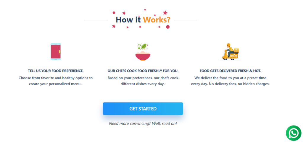 As you scroll down, you will find out how the subscription service works. It answers most of the customer’s doubts. The CTA box is added in blue color. They encourage customers to read on to find out more about their service, and they have added a Whatsapp chat facility for any queries from customers.