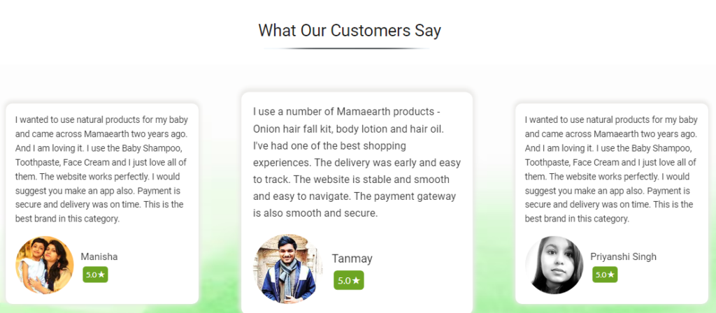Consider this example from the landing page of Mamaearth. It features testimonials from users who highlight how Mamaearth products have been beneficial to them.
