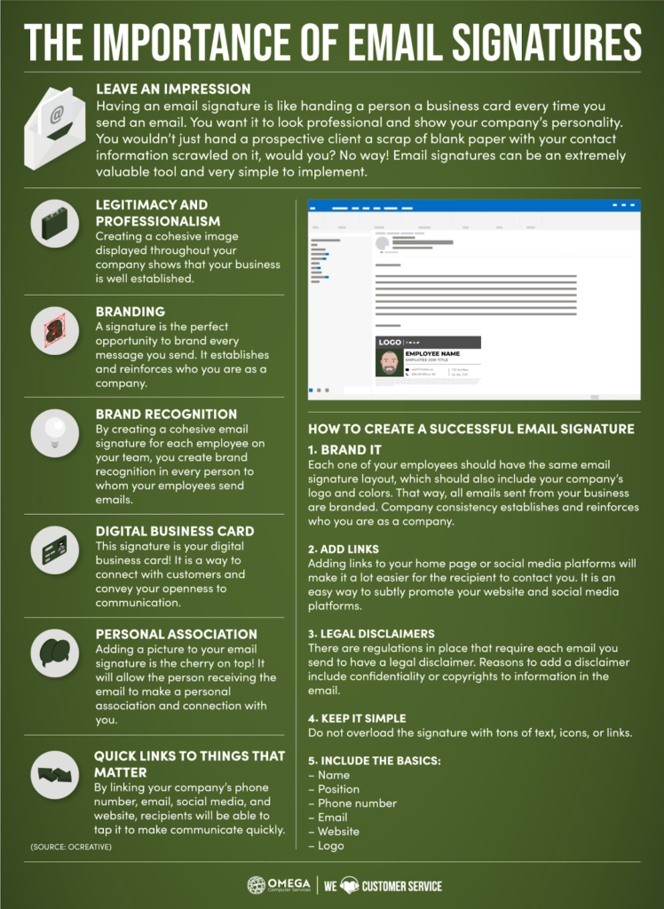 Signatures personalize every piece of communication sent out. Your company’s identity is developed and maintained through your signature, every time an individual reads an email from you. Don’t forget to create a consistent signature format for every employee.