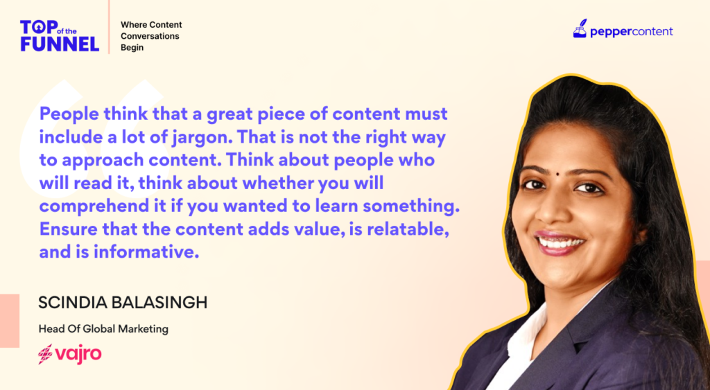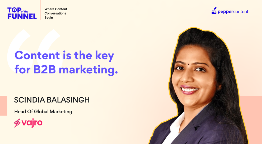 In this episode of Pepper Content’s Top of the Funnel, Natasha Puri, Content Marketing Lead at Pepper, explores the potential of content in the B2B marketing space with Scindia Balasingh, Head Of Global Marketing at Vajro. Scindia has always wanted to go for a role where she can build something and leave a legacy. She has previously worked with companies such as Freshworks, Blue Star Limited, and Redington India Ltd. At Freshworks, she worked as a part-time marketer for clients such as AWS, Survey Monkey, Slack, and more.