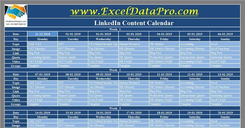 A LinkedIn content calendar is an Excel template that allows you to plan your LinkedIn posting strategy for the entire year, including a week-by-week publishing schedule.