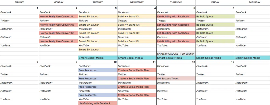 Are you using your social media calendar more conventionally? Use a Google Sheets template, such as this one from Firefly Marketing. Each tab represents a distinct month, and the spreadsheet includes all of the channels you’ll need at the top. The rows are organized by week so that you can quickly see when a post is scheduled to be up.