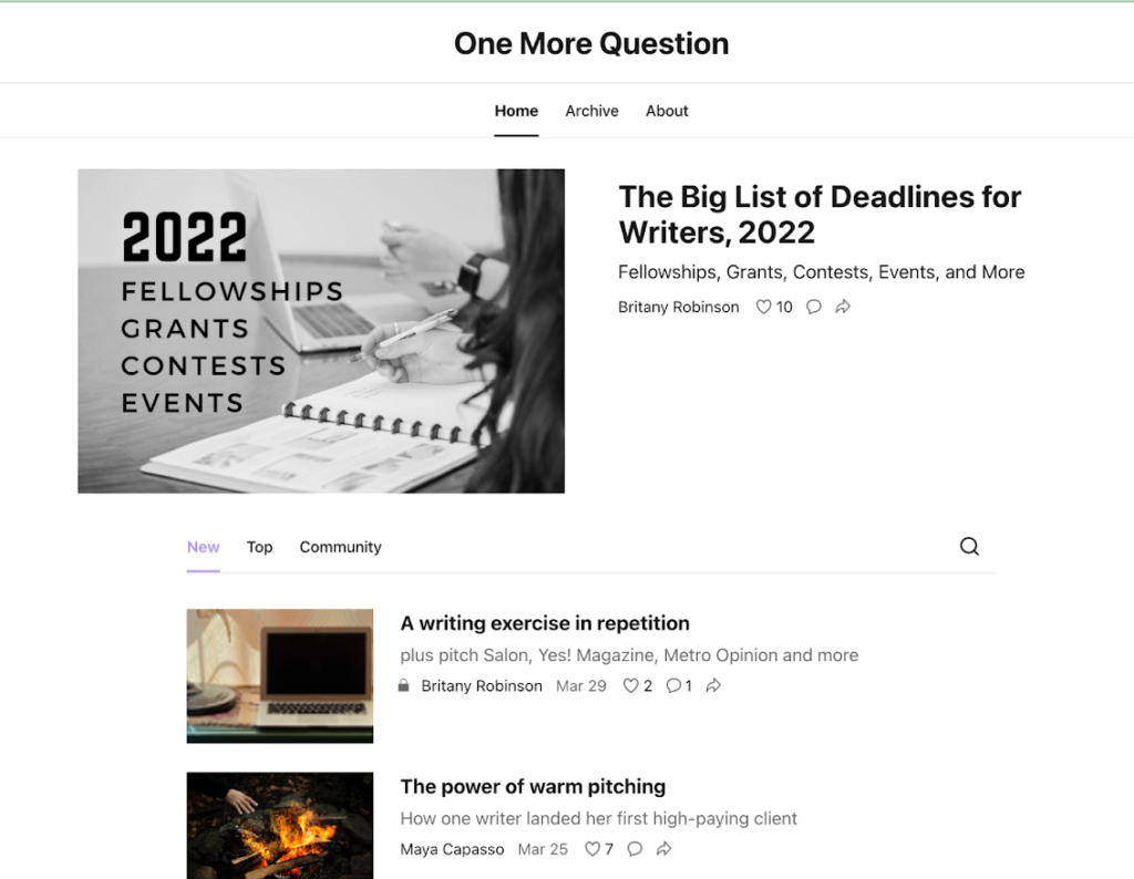 Britany Robinson’s One More Question is among newsletters worth subscribing to with similar content. This newsletter is aimed at helping other writers and journalists stay abreast with the latest trends and opportunities in the industry.
