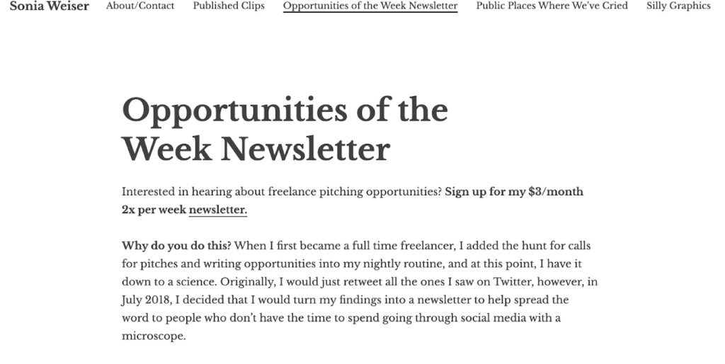 Ms. Weiser painstakingly compiles the creamiest freelance writing opportunities currently available twice a week. And you can get this information by subscribing to her newsletter for a meager $3 a month.