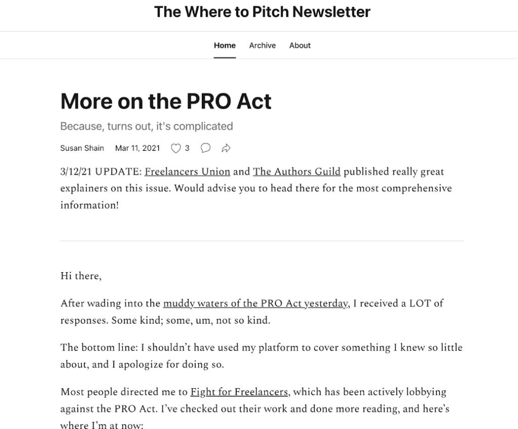 If you’re a writer looking for a push in the right direction to help you get published with a publication relevant to your vertical, then travel enthusiast and freelance writer Susan Shain’s Where to Pitch is the newsletter for you.