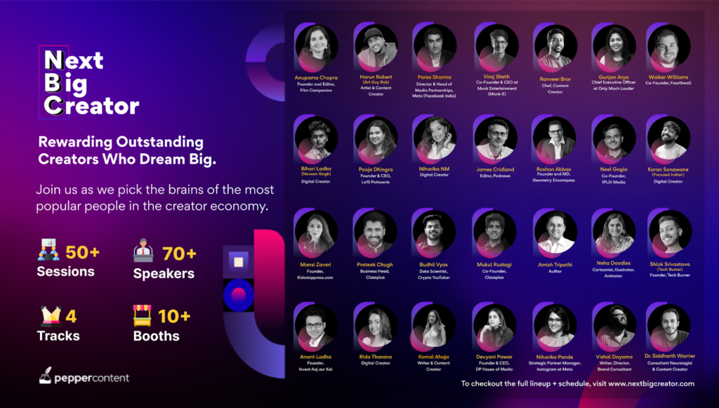 In the days running up to the NBC Summit, we hosted masterclasses and live sessions with some of the best people in the content industry. We also tied up with some of the most promising and unique brands to host booths, namely, Instagram, Meta, Bound, Creative Ideas Store, Skillshare, HeyHey Global, Tag Mango, DP House of Media, JB, Peppertype, Ticketh, Classplus, Ekatra, HT Smart Cast, Supermeme, The Surreal Studio, Woo Darts, The Blind Book Date, Colour Bloomers, Mind Peers, Art Gilehri