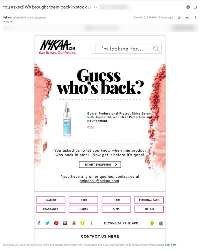 Nykaa has cleverly used email marketing to its full potential. As part of its promotional efforts, the company sends out emails to highly engaged buyers, including trending content that provides a glance at current industry trends. These emails also present an early look at any upcoming sales, urging consumers to visit the online store. Their email marketing plan has performed exceptionally well, with high open rates, engagement rates, and conversion rates. It has clearly been achieving the overall Nykaa marketing strategy goals.