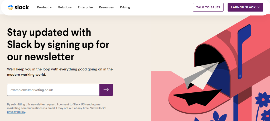 - It clearly mentions that by opting in, the user consents to receive marketing material from Slack. This is a good practice to keep in mind when you create an opt-in form for your company.