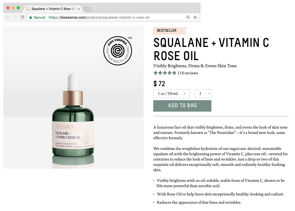 Here is a perfect example of a brand, Biossance, promoting its face oil, showing how to use keywords.