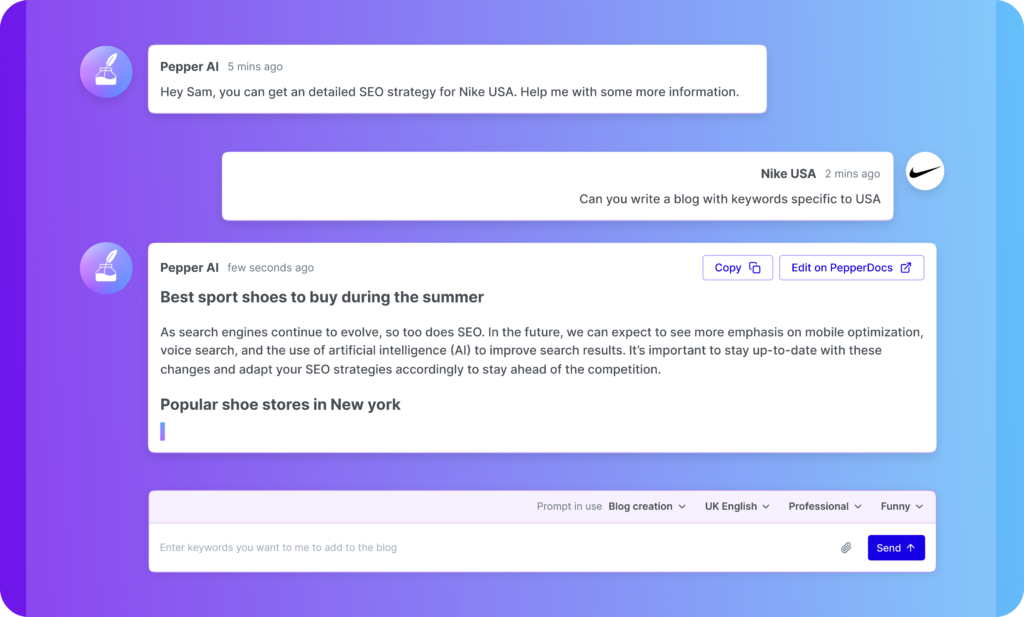 ChatGPT is a powerful technology that has opened up a world of possibilities in the generative AI space in the past few months. However, its limitations like its inability to provide highly personalized responses and the onus it puts on the user to derive maximum value from the tool, leaves marketers wanting more. This is where Pepper AI can fill in the gaps – it utilizes multiple data sources and APIs of tools like Google Analytics and SEMrush to name a few, to produce an output that is personalized to your business and its needs.
