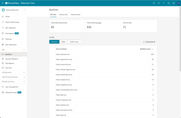 Bing Webmaster Tools is among the best free SEO tools that offer a wide range of features. From keyword research and backlink tracking to site audits, this free SEO tool allows you to run accurate reports and perform site scans to stay on top of the game.