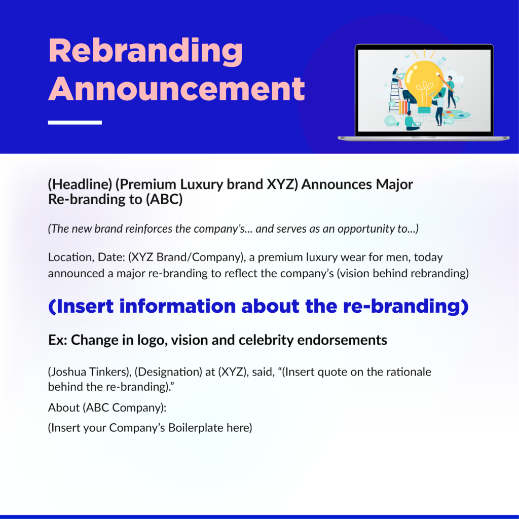 - When using a free or sample press release template, customize the details under the broad headers to suit your needs. Personalize according to your target audience.