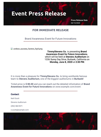 Events are a traditional way of getting face-to-face with journalists and your audience. They’re a great way to interact with journalists in an informal setting, and even build contacts that can come in handy later. Events can be press conferences, product launches, summits, award ceremonies, or movie screenings. Certain key things that a sample press release template for an event should have are as follows: