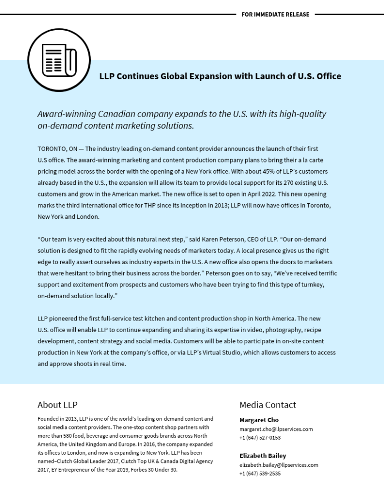 So you’re expanding operations to a new city or country, and opening up a new branch. You need to share this big milestone with your audience. You can check out several free press release templates online, just like the one above, which will tell you what details to include. Start with the most basic details.