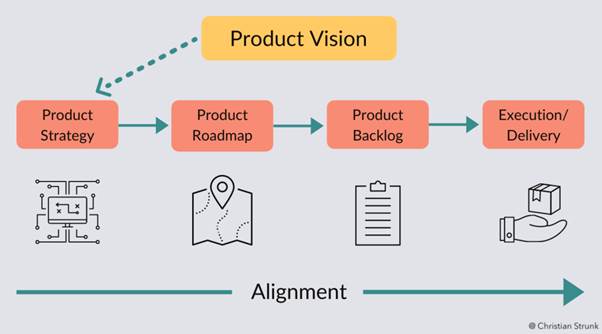 ○ The product strategy defines the product development journey (the “how” of the process).