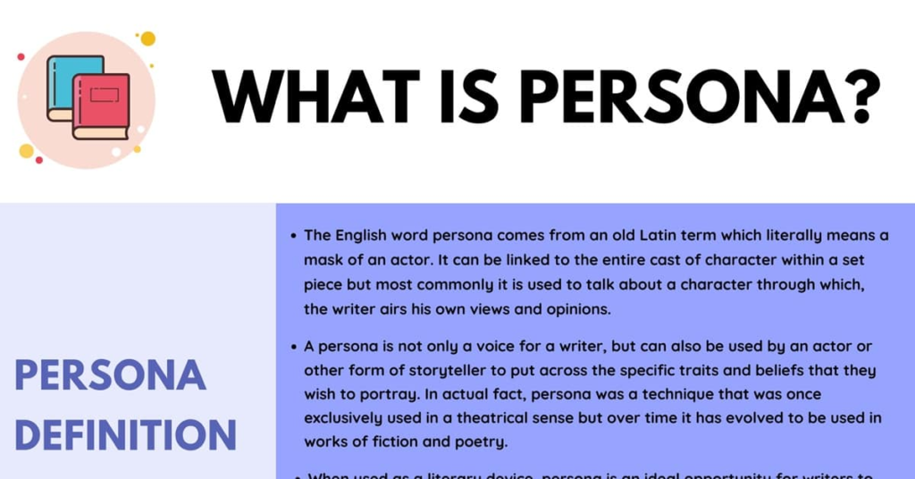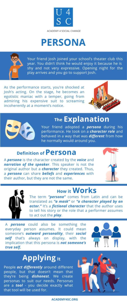 Persona: A person’s personality, facade worn by a man or a woman, identity of an individual, mask put on by a person, the front portion of a human being, exterior guise adorned by a character, role played by someone, the personality of an actor, the image of a mortal soul, the public face of a fellow.