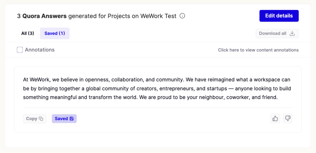 The goal of creating a Quora answer is to get an informative and accurate answer to the question. I personally prefer it to be a bit detailed – start with setting a bit more context about the question (in this case, WeWork), then a brief answer to the query, and end by elaborating on it.