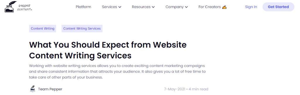 Each blog is also associated with two or more tags. In the example below, the tags associated with this blog are “content writing” and “content writing services.”