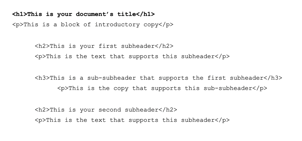 Headings are another significant aspect of your on-page content. They lend structure to your content and help Google get a better idea of what your page is all about. The primary subheading of your HTML document is wrapped in the <h2> tag, and further subheadings are wrapped in tags ranging from <h3> and <h6>.