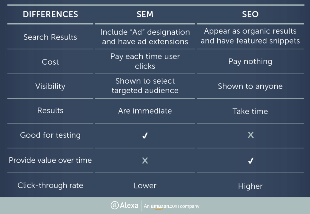 - SEO or content marketing takes time and effort to see returns; however, SEM fetches relatively faster results.