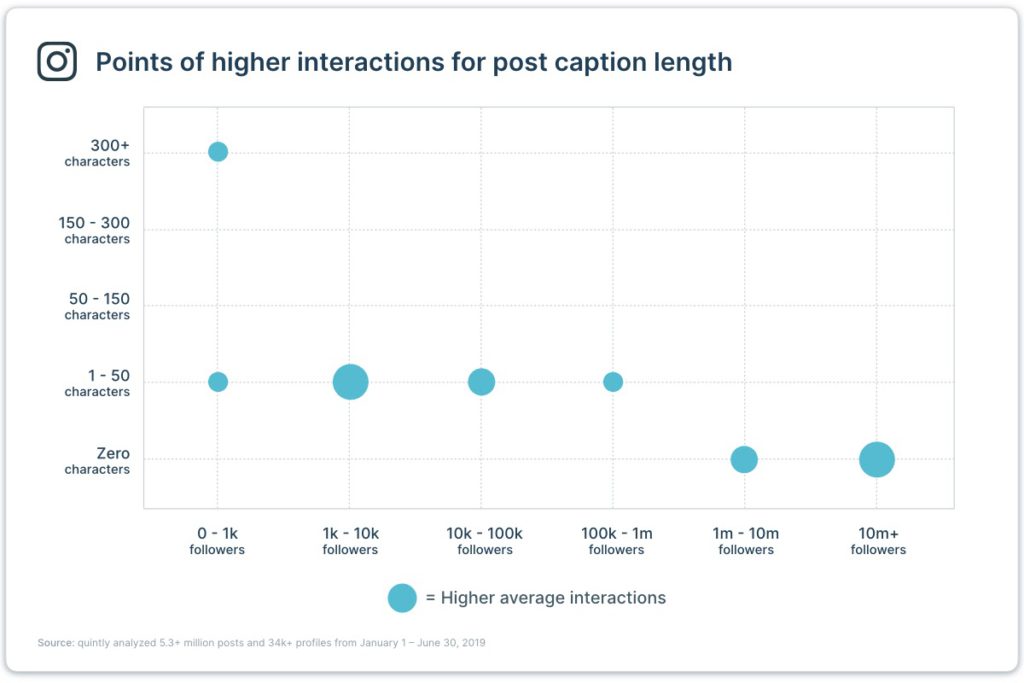 For instance, in Instagram captions, while 2200 characters is a lot of caption real estate, large text blocks can look messy and distract audiences from the photo or video. Thus, Quintly found that the ideal length is 1-50 characters, which drives more interactions according to an analysis of 5.9 million posts.