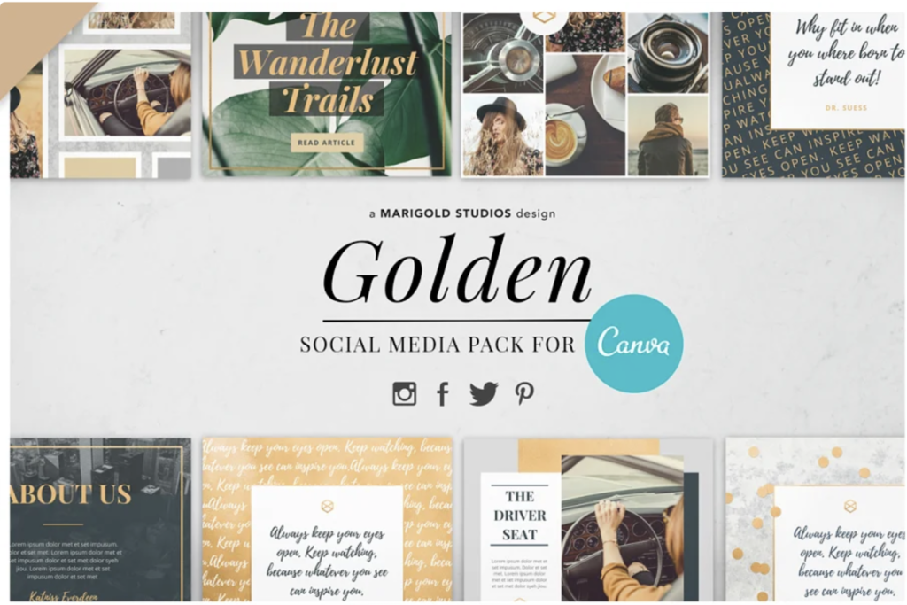 Created by Marigold Studios, this golden-themed social media pack works for Canva and Powerpoint. As a comprehensive bundle, it works perfectly if you’re working in the beauty and art industry.