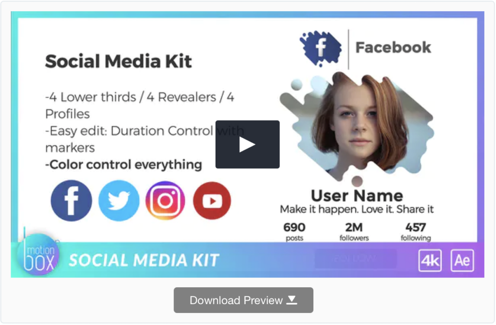 If you are wondering how to create stunning after-effects with videos, this is the answer for you. This easy-to-use template uses smart color controllers and markers. You can create ten- and 20-second intros on varied social platforms. And the best part? You do not require any plugins. Simply download the kit and get going. Spruce up any video content with this social media graphic template!