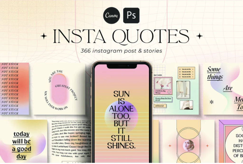 The pack has movable elements, and you can use it for Canva and Photoshop. You even have the option of customizing the fonts and colors. If you are an influencer, life coach, or artist, or would simply like to post something inspirational on your account, then this template is for you.