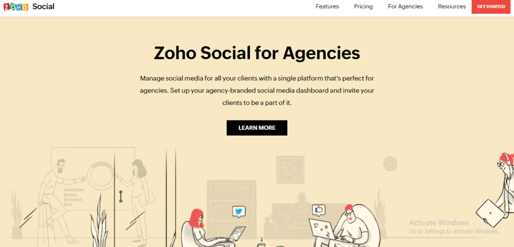 Zoho provides tools for agencies to manage all clients under one roof. These tools include post scheduling, publishing calendars, content curation, discovering trends, monitoring brand conversations, statistics and analysis, customer reports, and much more.