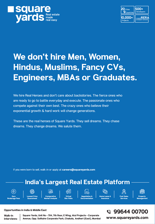 Designed by a firm called Platinum Outdoors of Madison World, the main aim of Square Yards ads, released all over the country as a part of the Out-of-Home Advertising (OOH) campaign in 2021, is to objectify by building knowledge about the brand and increasing traffic to its website.