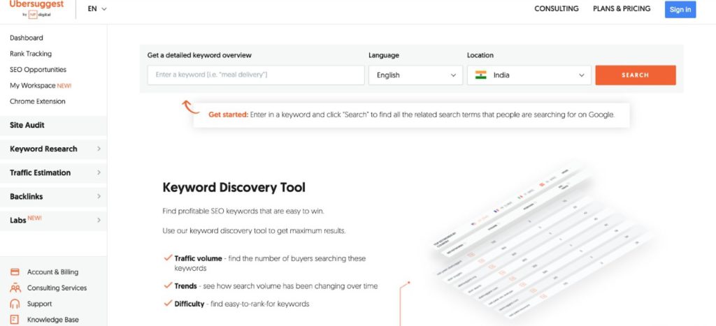Neil Patel’s Ubersuggest is a keyword-tracking tool that can take you through the SEO steps to improve your website performance without much difficulty. Besides identifying keywords, the tool helps you search the intent behind them by displaying the top search engine page results derived from long-tail keywords.