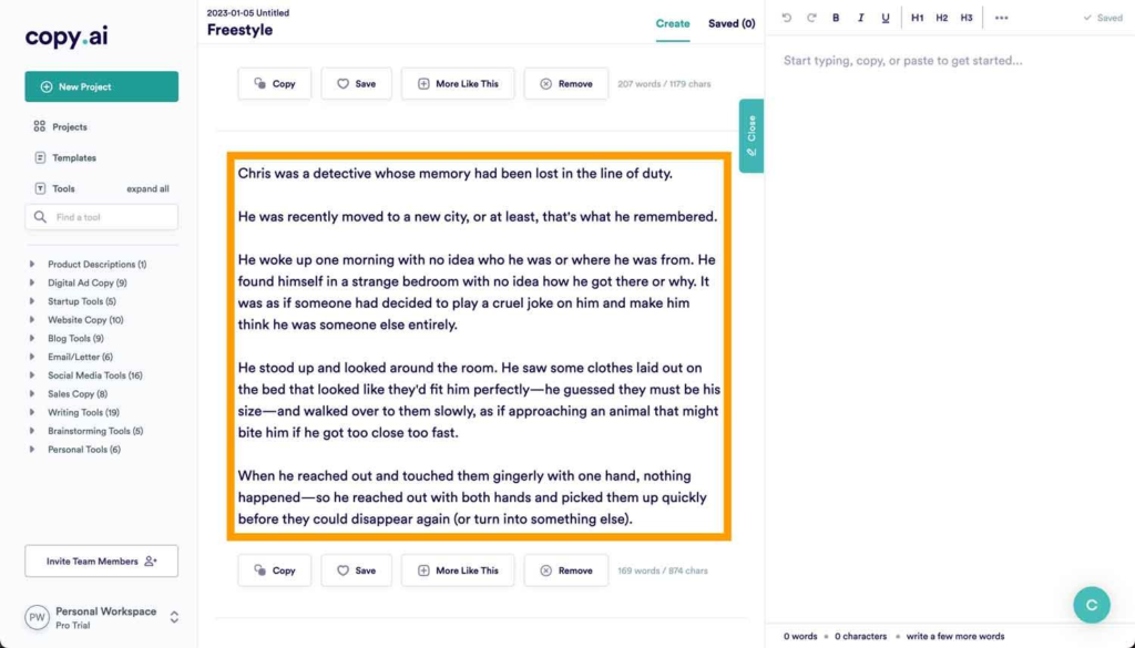 - Copy AI’s Freestyle template is perfect for generating stories based on specific details.