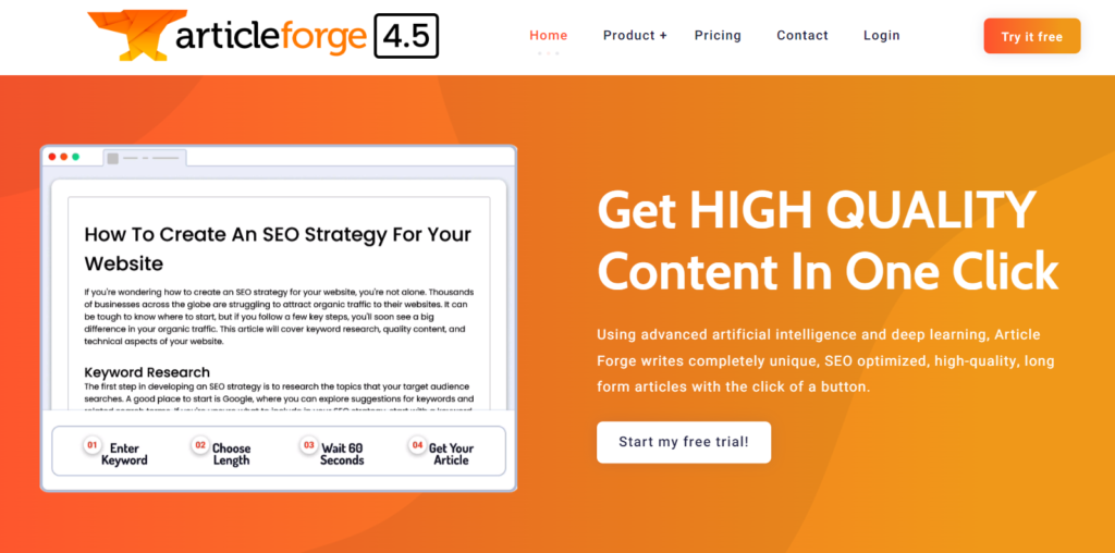 Article Forge uses algorithms and artificial intelligence to create stories in seconds. It is a simple AI story generator that requires no prior training or expertise. By entering a single keyword or longtail keyword, you can start writing your script with ease.
